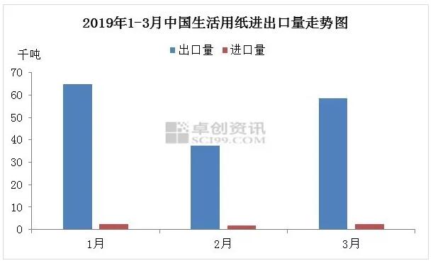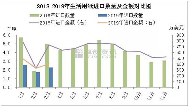 如图3所示,据海关统计2019年一季度中国生活用纸进口6.58千吨,其中原纸进口4.15千吨、成品纸进口2.43千吨,同比减少47.45%,环比减少31.76%;进口金额1223.55万美元,其中原纸进口642.93万美元、成品纸进口580.62万美元,同比减少33.19%,环比减少25.82%。