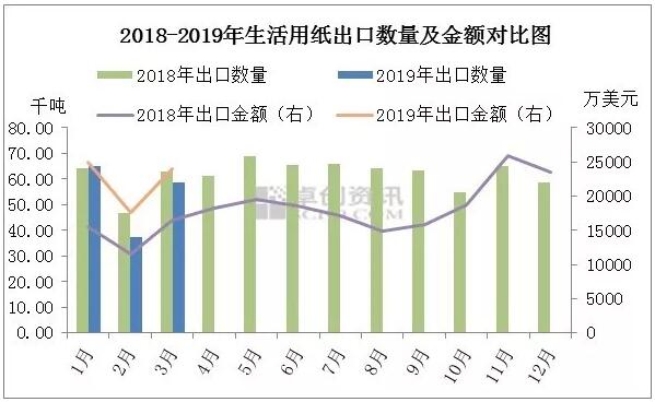 如图2所示,据海关统计,2019年一季度中国生活用纸出口160.81千吨,其中原纸出口38.39千吨、成品纸出口122.41千吨。同比减少7.71%,环比减少10.02%;出口金额66539.59万美元,其中原纸出口6007.60万美元、成品纸出口60531.99万美元,同比增加53.10%,环比减少2.57%。2019一季度出口情况与2018一季度大致相同。