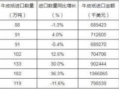 - 2019年1-9月中国牛皮纸进口量为119万吨,同比下降11.6%
