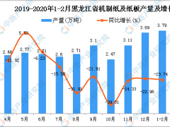 - 2020年1-2月黑龙江省机制纸及纸板产量为3.79万吨 同比下降23.74%