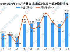 - 2020年1-2月吉林省机制纸及纸板产量7.52万吨 同比增长19.94%