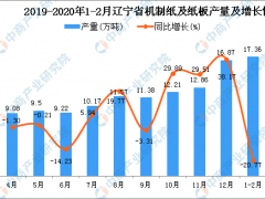- 2020年1-2月辽宁省机制纸及纸板产量17.36万吨 同比下降20.77%