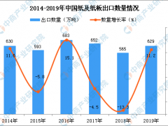 - 2019年中国纸及纸板出口量为629万吨 同比增长11.2%