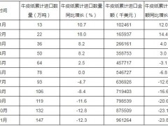 - 2019年1-11月中国牛皮纸进口量为147万吨