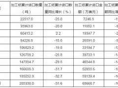 - 2019年1-10月加工纸进口数量为205330吨,同比下降31.6%