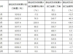 - 2019年1-10月感应纸及纸板进口数量为7607吨,同比增长8.0%