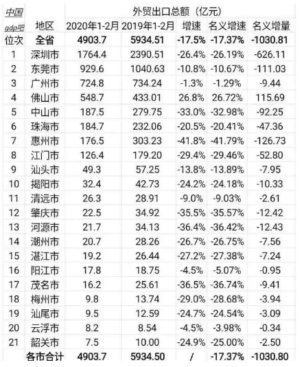 根据中国GDP吧数据统计显示,2020年1-2月,仅广东一省的外贸出口总额就比去年同期减少了1030.80亿元。根据外贸出口总额的5%为纸包装额度的比例计算,光是广东一省,外贸出口的纸包装总额就损失了50亿元。