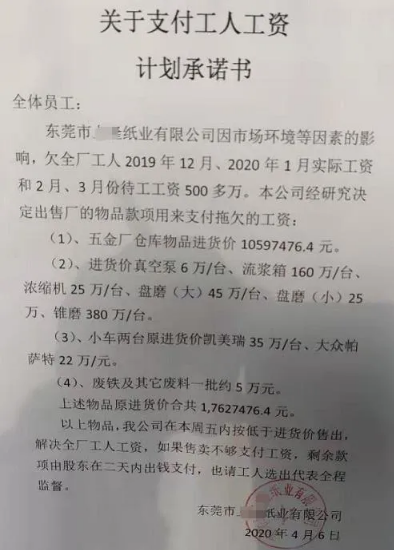 4月6日,东莞这家纸厂向员工发出了《关于支付工人工资计划承诺书》,称工厂因市场环境等因素的影响,欠全厂工人2019年12月、2020 年1月实际工资和2月、3月份待发工资500多万。公司经研究决定出售工厂的物品用来支付拖欠的工资。