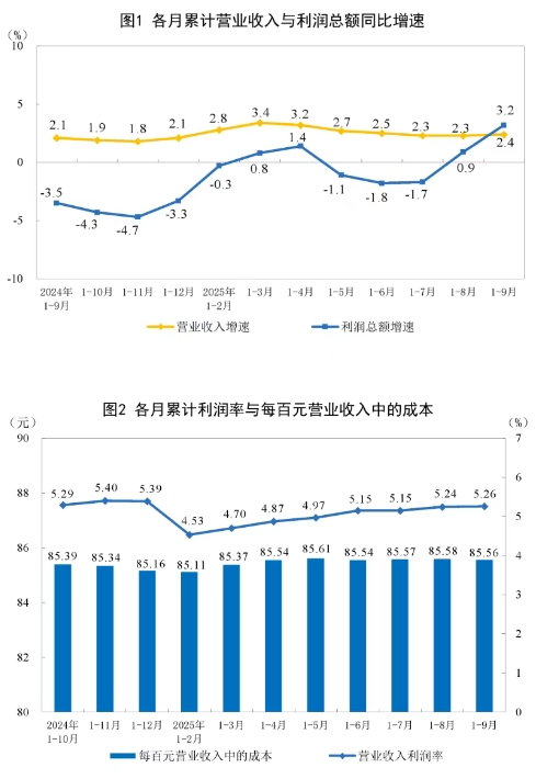 国家统计局工业司首席统计师于卫宁解读2025年1—9月份工业企业利润数据表示,1—9月份,各地区各部门认真落实更加积极有为宏观政策,培育壮大新经济增长点,高技术制造业、装备制造业等新质生产力较快增长,叠加低基数效应影响,规模以上工业企业利润增速继续回升。具体表现为:工业企业利润加快恢复;工业企业营收增长加快;过半行业利润增长,六成行业增速回升;高技术制造业带动作用明显;装备制造业支撑有力,部分行业增长较快;不同规模类型企业利润均有改善,私营和外资企业利润明显加快;营收利润率回升。