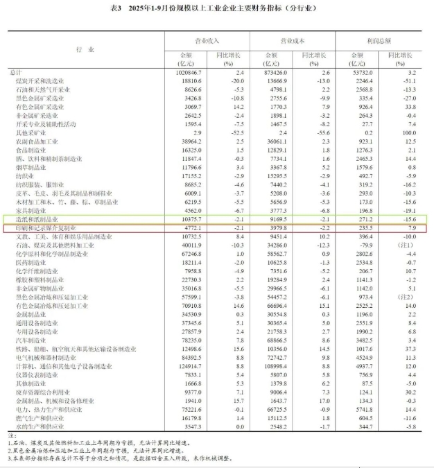值得关注的是,造纸和纸制品业实现利润总额271.2亿元,同比下降15.6%;印刷和记录媒介复制业实现利润总额235.5亿元,同比增长7.9%。