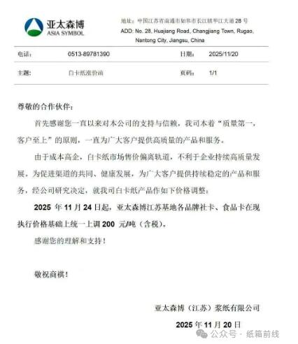 APP(中国)工业用纸事业部:自2025年12月1日起,公司针对宁波亚洲浆纸业有限公司和广西金桂浆纸业有限公司生产的所有产品在2025年11月价格基础上调涨涨价200元/吨(含税)。
