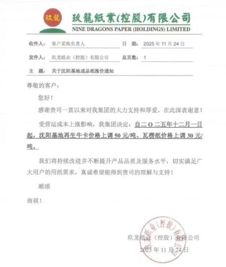 从2025年11月28日起,针对集团旗下白犀包装纸产品在现有价格基础上,上调 50 元/吨。