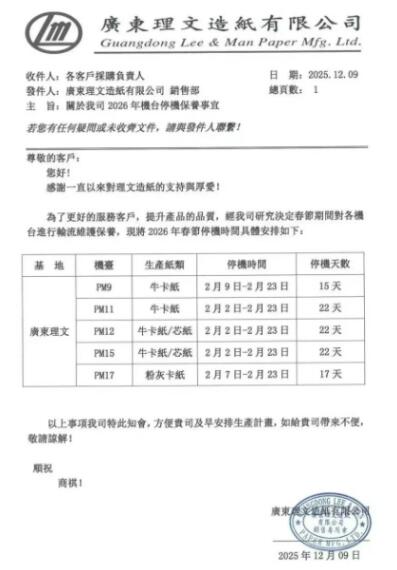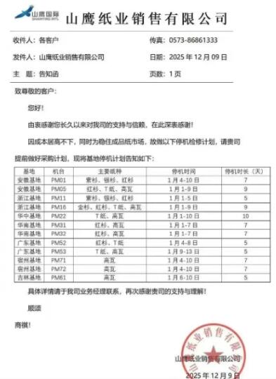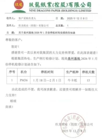 三家龙头纸企宣布停机计划,预计2026年初减产约27万吨包装纸