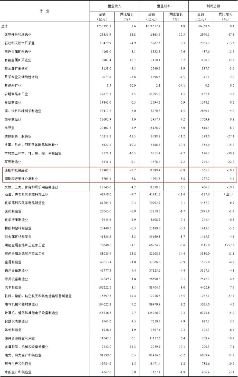 在营业收入方面,规模以上工业企业实现营业收入125.34万亿元,同比增长1.6%。其中,造纸和纸制品业实现营业收入12808.5亿元,同比下降2.7%;印刷和记录媒介复制业实现营业收入5765.1亿元,同比下降3.8%。