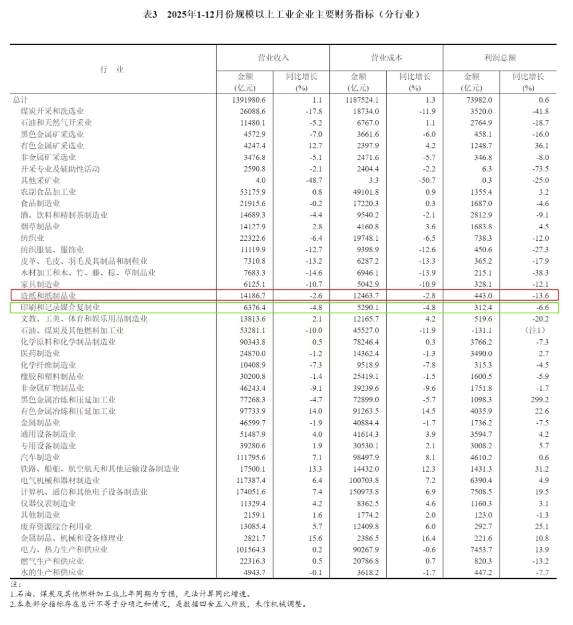 值得关注的是,造纸和纸制品业实现利润总额443.0亿元,同比下降13.6%;印刷和记录媒介复制业实现利润总额312.4亿元,同比下降6.6%。