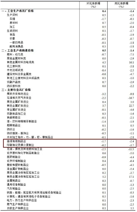 值得关注的是,2026年1月份印刷和记录媒介复制业工业生产者出厂价格同比下降3.7%;造纸和纸制品业工业生产者出厂价格同比下降2.4%。