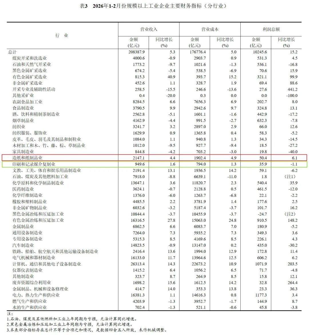 值得关注的是,造纸和纸制品业实现利润总额50.4亿元,同比增长6.1%;印刷和记录媒介复制业实现利润总额35.9亿元,同比下降1.1%。