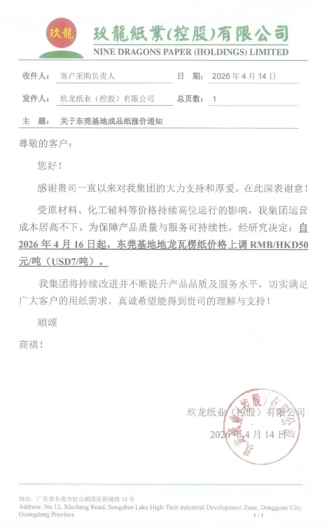 自2026年4月16日起,东莞基地地龙瓦楞纸价格上调RMB/HKD 50元/吨(USD7/吨)。