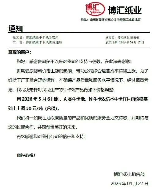 自2026年5月6日起,A类牛卡纸、N牛卡&防水牛卡在目前价格基础上上调50元/吨(含税)。