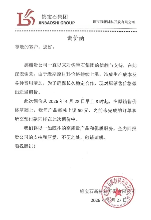 从2026年4月28日早上8时起,在原销售价格基础上,我司产品每吨上调50元,之前未完成的订单和所交预付款同样在此次调价中。