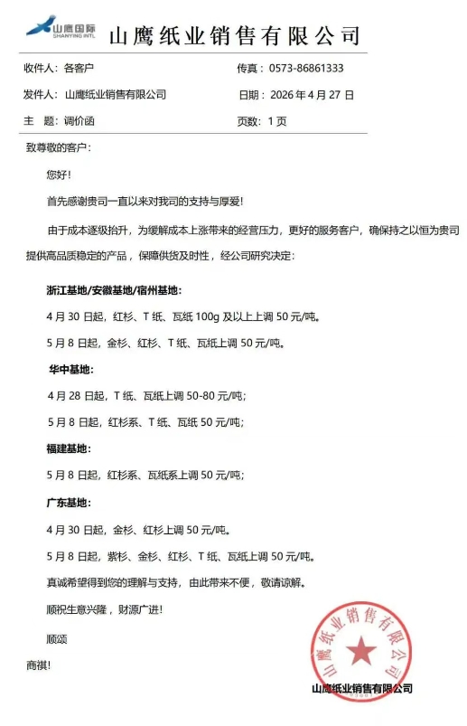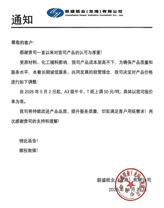 自2026年5月2日起,A3级牛卡、T纸上调50元/吨;具体以我司报价单为准。