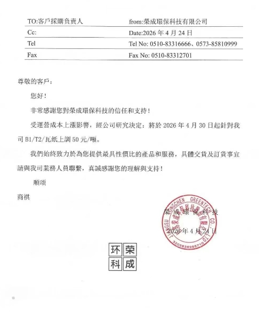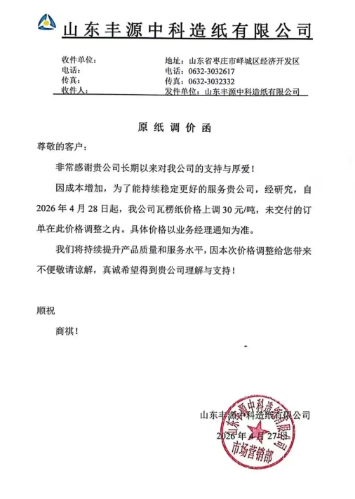 自2026年4月28日起,我公司瓦楞纸价格上调30元/吨,未交付的订单在此价格调整之内。具体价格以业务经理通知为准。
